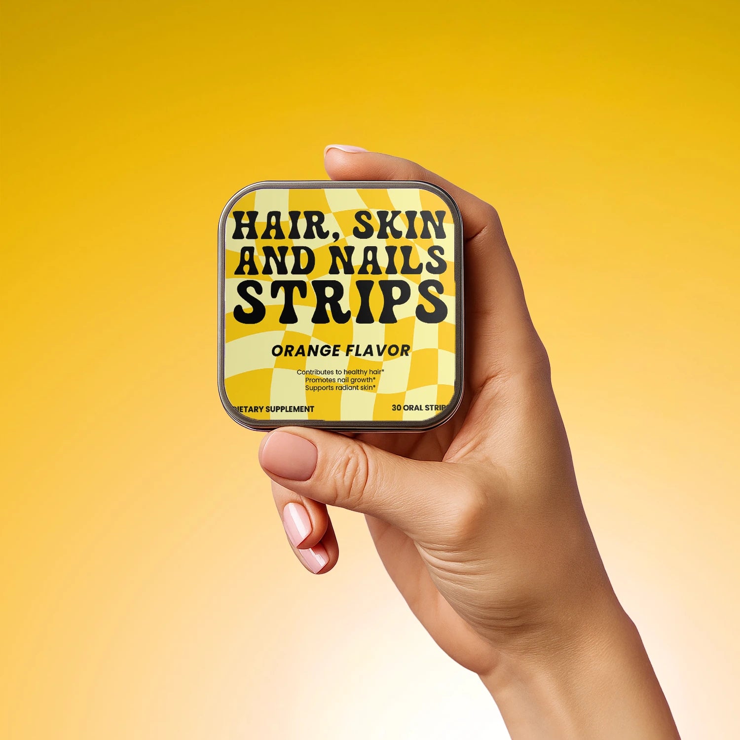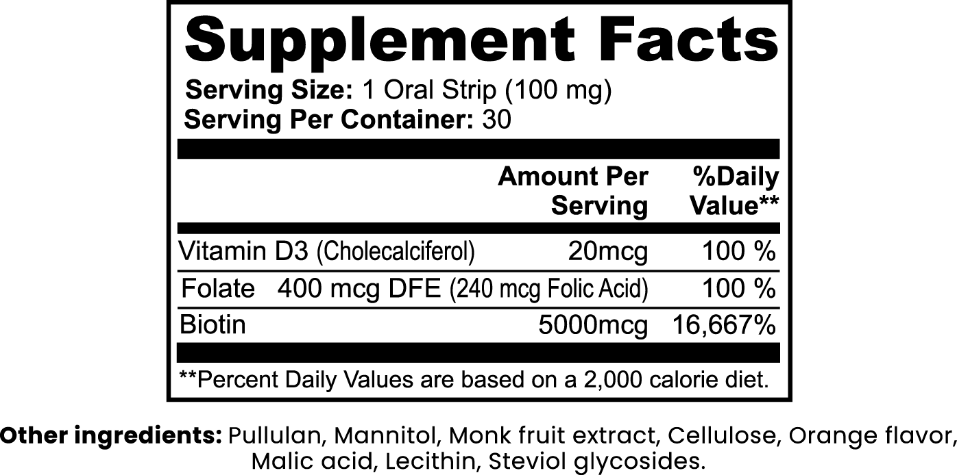 Each strip melts on your tongue and delivers a precise blend of Biotin, Folate, and Vitamin D3 — essential nutrients that help maintain vibrant hair, glowing skin, and resilient nails from within. No pills. No sugar. No effort.